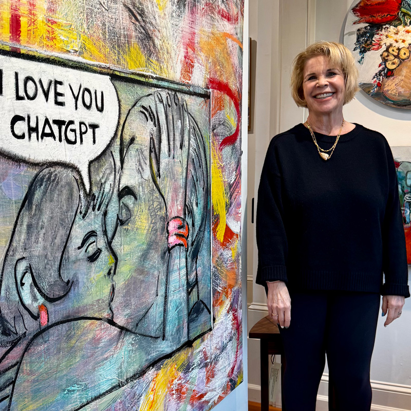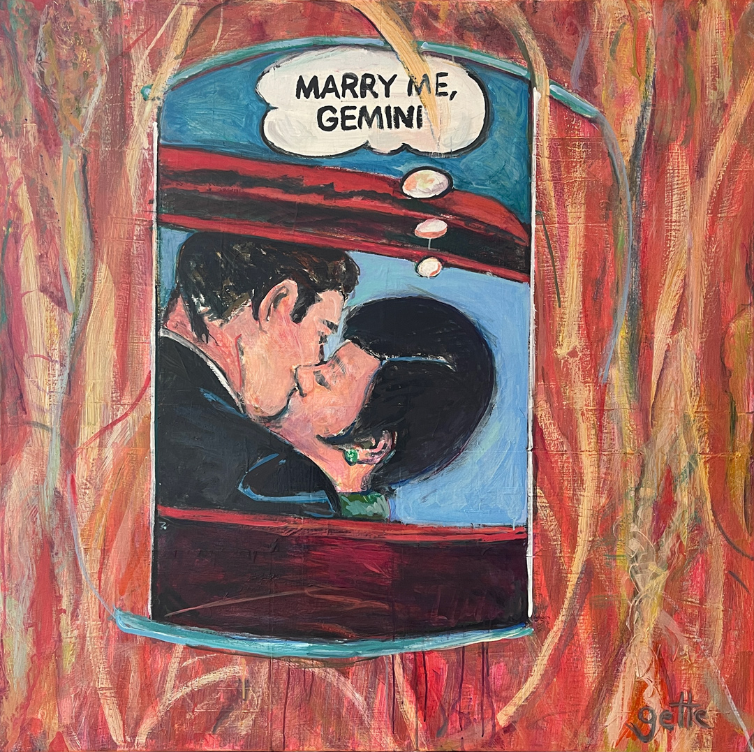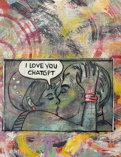 This body of work grew out of that spirit of curiosity and play. These paintings blend the visual language of vintage romance comics with the optimism, humor, and questions of our digital present. They are not intended as satire or critique, but as affectionate explorations of connection—between people, ideas, and the tools we use to communicate. The work is meant to be lighthearted, hopeful, and joyful.