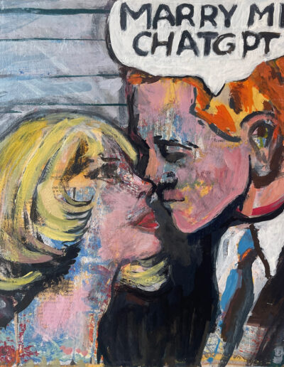 These paintings blend the visual language of vintage romance comics with the optimism, humor, and questions of our digital present. They are not intended as satire or critique, but as affectionate explorations of connection—between people, ideas, and the tools we use to communicate. The work is meant to be lighthearted, hopeful, and joyful.