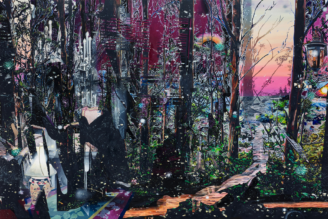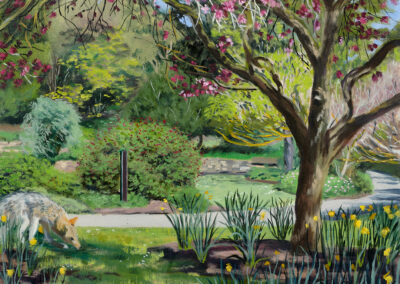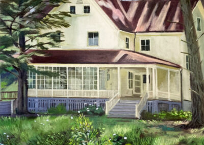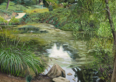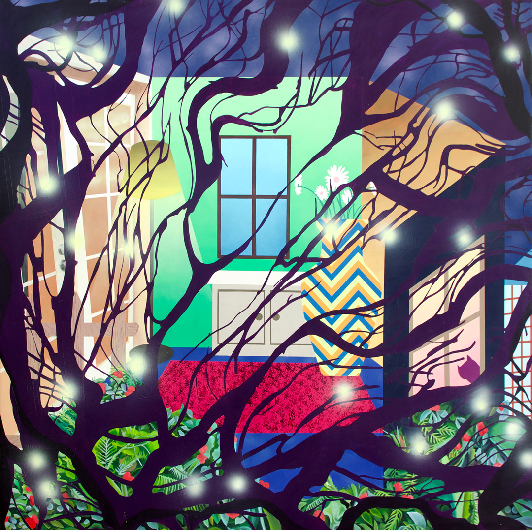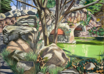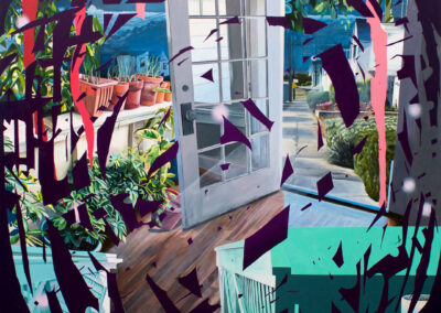Fluidity of Perception refers to a “Landscape of the Mind”: a psychological landscape that reflects the subjectivity of our perceptions. In order to create these paintings, I collage disparate landscape and interior elements to create a dreamlike space that is logical yet elusive. The result is a painting that features many landscape elements, but is ultimately a psychological space that feels as though it is in the midst of being edited. The landscape is the most appropriate mode of painting to depict the mind because it suggests vastness, fullness, and emptiness simultaneously. Ultimately the question I am exploring is: can I render how beliefs, memories, and ideas evolve? How can I capture, pictorially, the way my mind is putting together my reality?